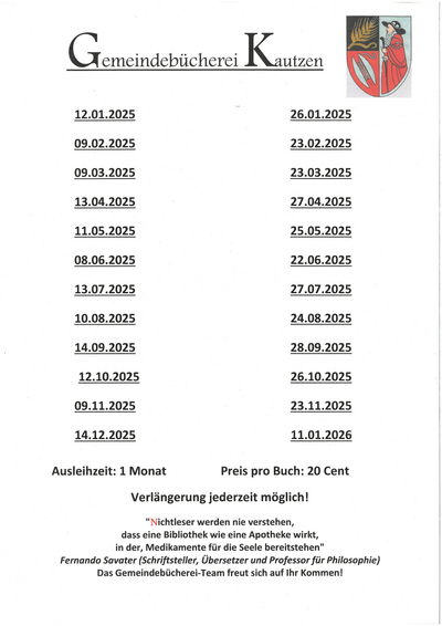 Die Gemeindebücherei ist grundsätzlich jeden zweiten Sonntag geöffnet und zwar in den geraden Kalenderwochen (also Woche 2, 4, 6, 8, . . . .).